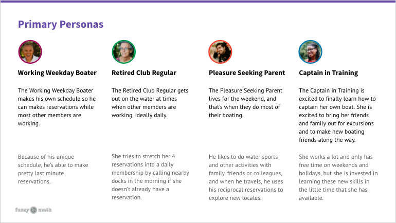 To better understand their goals and pain points, we conducted user interviews with 15 current and prospective Freedom Boat Club members. Through this research, we developed four primary personas: