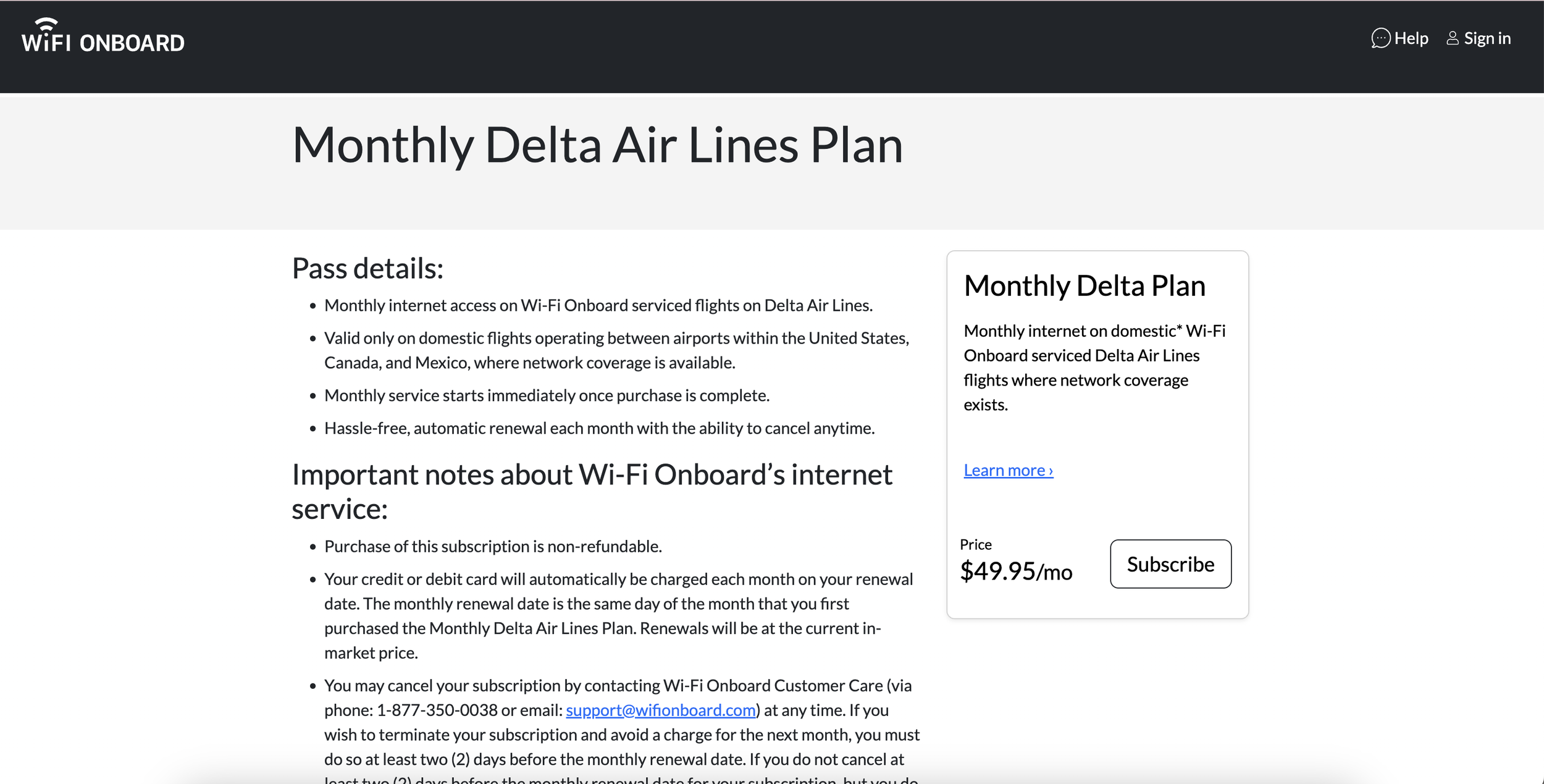 Wi-Fi Onboard invites users to browse and purchase Wi-Fi passes & subscriptions from their preferred airline, plus sign up, sign in, manage their account, or contact customer care before they fly.